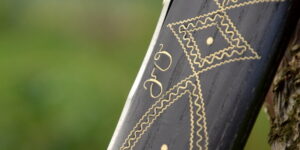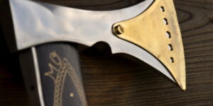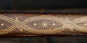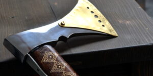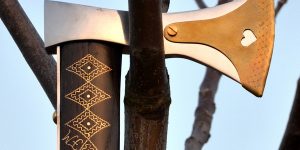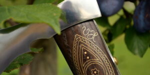 Vybíjaná funkčná valaška, zdobenie vybíjaním, vbíjaný mosadzný plech do dreva, stará slovenská metóda zdobenia dreva kovom.